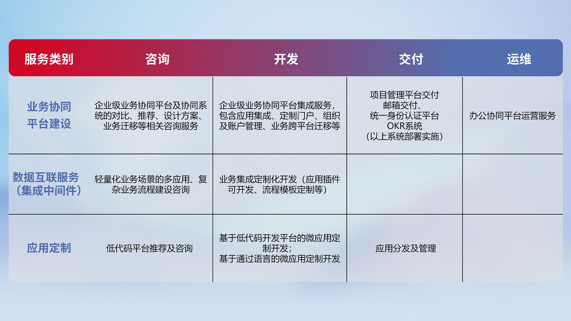 针对钉钉、、、企微、、、IDaas等平台级产品提供产品的规划、、方案、、、交付、、、定制化开发等服务,,实现如统一协同办公、、、智能客户服务、、混合会议管理、、、、智能数据查询、、等业务场景,,,,实现数字化转型。。。