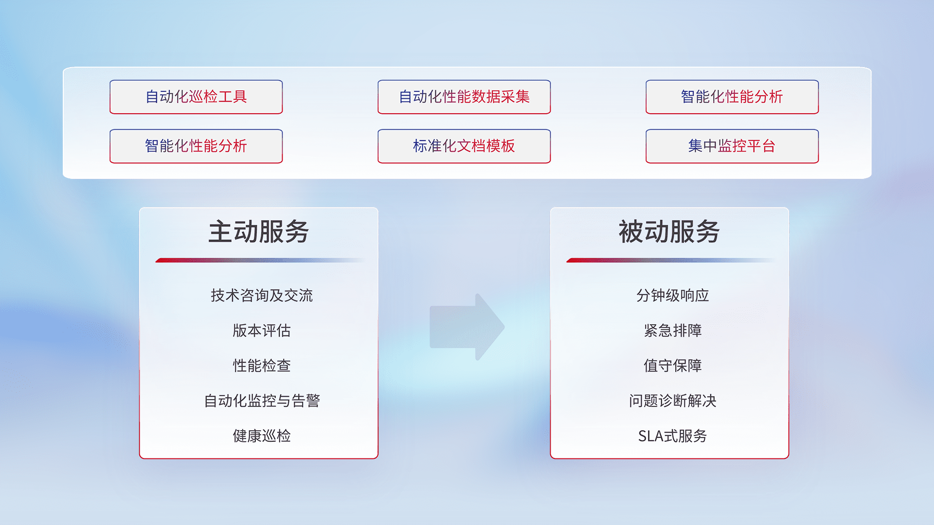智能化工具和标准化文档,,保障服务质量,,,,提供主动服务(包含技术咨询、、、版本评估、、、性能检查、、、自动化监控与告警、、、、健康巡检)和被动服务包含(分钟级响应、、、紧急排障、、、值守保障、、、问题诊断解决、、、SLA服务)。。。。