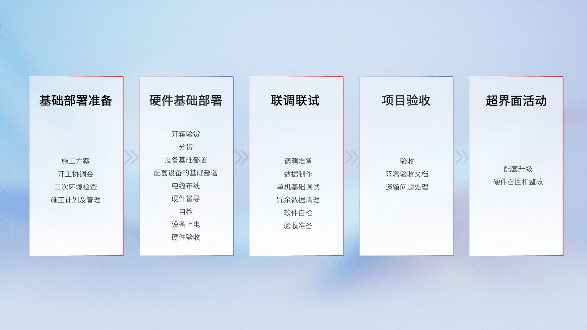 从基础部署准备、、硬件基础部署、、、、联调联试、、项目验收、、越界面活动的全过程可追溯,,,保证施工质量和进度。。